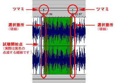 とくに試聴開始点と選択箇所の破線が重なっている場合には、両者を混同しないように、また操作するポイントを間違えないよう、注意が必要です。