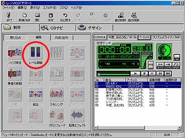 ミュージックCDデザイナー3の編集機能のなかでも基本的なもののひとつが、ここで紹介する「レベル調整」機能です。これは、CDに複数の曲を納める場合によく生じてしまう「曲ごとの最大録音レベル(音量)の差」を、縮小するための機能です。