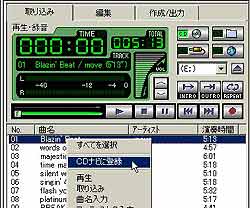 試聴用のデータを作るには、[制作]タブ−[取り込み]タブを表示して音楽CDをCD-ROMドライブに挿入。入力ソース情報ウィンドウにCDの情報が表示したら、メニューバーの[CD]−[CDナビに登録]をクリックします。または、トラックを選択して右クリックメニューから[CDナビに登録]を選びます。 |