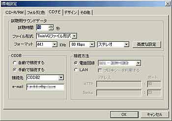 なお、試聴用サウンドデータのファイル形式は、MP3、WMA、TwinVQから選ぶことが可能で、これは[環境設定]ダイアログボックスの[CDナビ]タブで選ぶことができます。また、試聴用データは初期設定では10秒の演奏ですが、これも好きな長さに変更することが可能です。