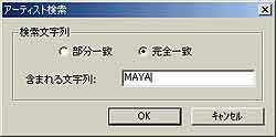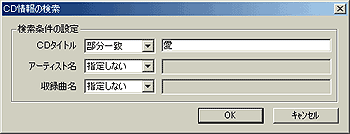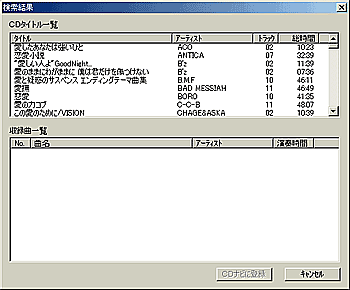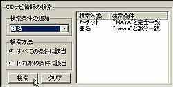 これで検索対象と検索条件が設定されるので、複数設定したい場合は今の操作をもう一度繰り返し、[CDナビ]画面の[検索]ボタンをクリックすると、左下の音楽CDの一覧リストに条件が合致した音楽CD情報が表示されます。 |