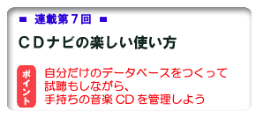 ミュージックCDデザイナー3では、手持ちの音楽CDや作成した音楽CDのアルバム、曲名、アーティスト名などの情報をデータベース化しておく、CDナビという機能を持っています。