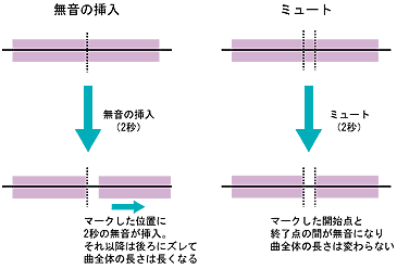 ミュージックCDデザイナー3の編集機能には、「無音の挿入」と「ミュート」という似たような機能があります。