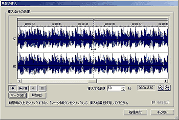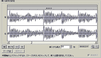するとトラックの波形を表示したウィンドウが開くので、再生ボタンで演奏を聴きながら、挿入したい位置で一時停止ボタンをクリック。[マーク]ボタンをクリックすると、カーソルの停止位置が無音の挿入ポイントとなります。