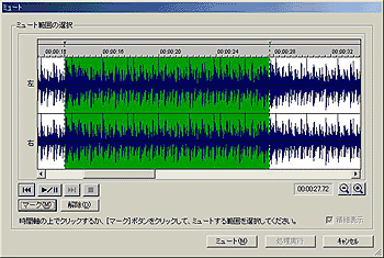 こちらも波形を表示したウィンドウが開くので、演奏を聴きながらまたはマウスで波形をポイントして、[マーク]ボタンをクリックするとミュートの開始点が決定されます。終了点も同様にして決定した後、[ミュート]ボタンを押すと処理が行われます。