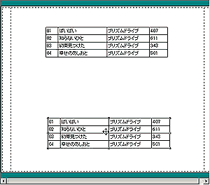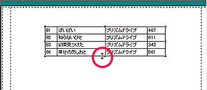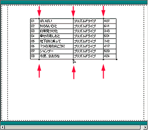 また、描画ツールバーから[頂点編集ツール]を選択した後、CDトラックデータオブジェクトをクリックするとオブジェクトの上下にハンドルが表れるので、これを左右にドラッグするとトラック番号/曲名/アーティスト/演奏時間のそれぞれの間隔を変えることができます。