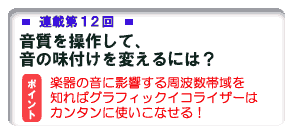 楽器の音に影響がある周波数帯域は、例えばバスドラムの膨らみを出すには100〜200Hz、ベースの重量感を出すときには250〜800Hz、音のきらびやかさを出すには2〜8KHzといったぐあいにある程度の範囲を持っています。