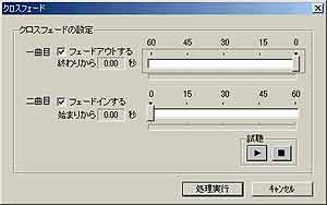 [クロスフェード]ダイアログボックスでは通常はフェーダーをスライドさせてクロスフェード時間を設定しますが、この場合フェーダーを「0」の位置にして[処理実行]ボタンをクリックします。