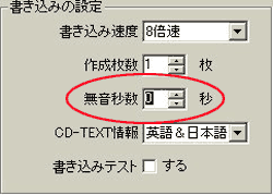 もう1つの方法は、[作成/出力]タブの書き込みの設定の中にある「無音秒数」で設定を行ないます。