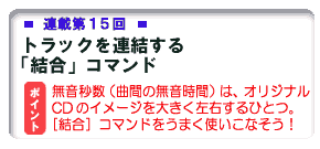 音楽CDを作成する際、ダンスミュージックのCDのようなノンストップミックスCDを作りたい、あるいは複数の曲を途切れ目なく再生したいというときがあります。このような場合は、「結合」コマンドを使います。