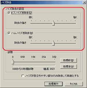 編集パネルから「ノイズ除去」を選択します。すると[ノイズ除去]ダイアログボックスが表示されるので、「ヒスノイズ」「ハムノイズ」のスライダーで除去する強さを設定して[処理実行]ボタンをクリックします。