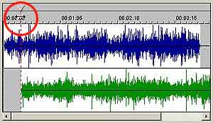 波形グラフのすぐ上にある時間表示部分の逆三角形のツマミ(▼)をドラッグするか、または混合するトラックの波形グラフをドラッグして、混合するトラックの開始位置を指定します。