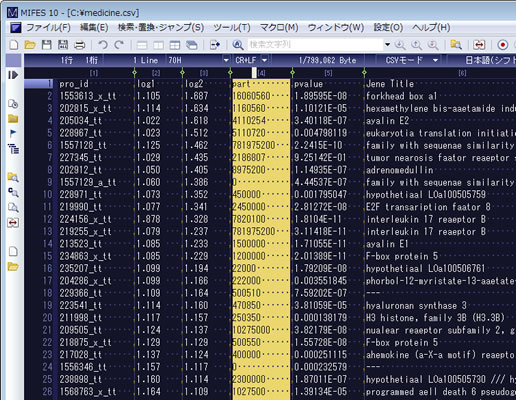CSVファイルは表計算ソフトやWindowsの標準エディタでも開けますが、開くのに時間がかかる上に、くちゃくちゃっとなってしまうのですが、MIFESなら、軽快に開いて、ちゃんとセルで表示されるので助かっています。