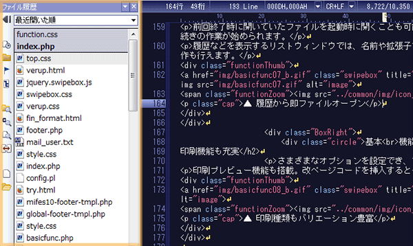 例えば、シフトJISで作成したファイルをWeb用にUnicodeに変換して保存したり、Macで作成したテキストファイルの改行(CR)やUnix環境で作成したプログラムの改行(LF)を、Windows用にCR+LF改行に変換して保存したりすることも可能です。