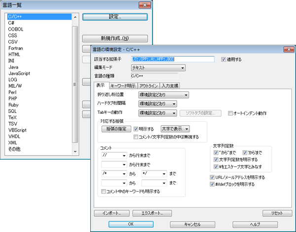 プログラム言語、Webファイル、データファイルなどの拡張子ごとに、表示や動作の設定がまとめてでき、ファイルの特長やユーザーの好みに応じた設定が可能です。