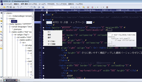 編集ウィンドウを構造にそって折りたたみ表示できます。