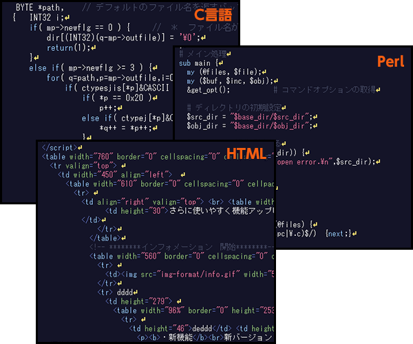 プログラム言語の予約語や変数など特定のキーワードやコメント部分、文字列定数などを異なる色で表示します。