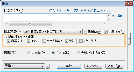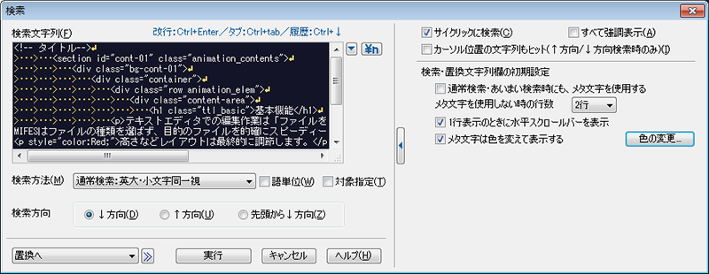 その他にも、語単位での検索、検索方向(先頭から、下へ、上へ)、ヒット文字列の強調表示、サイクリック検索など、多彩なオプションを指定できます。