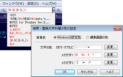 また、「ワイルドカード検索」「正規表現検索」時には、「*」や「?」などの記号(メタ文字)を色替え表示できます。