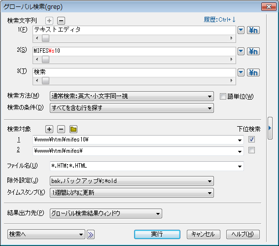 グローバル検索(grep)は、文字列を3つまで対象のフォルダーを5つまで指定できます。
