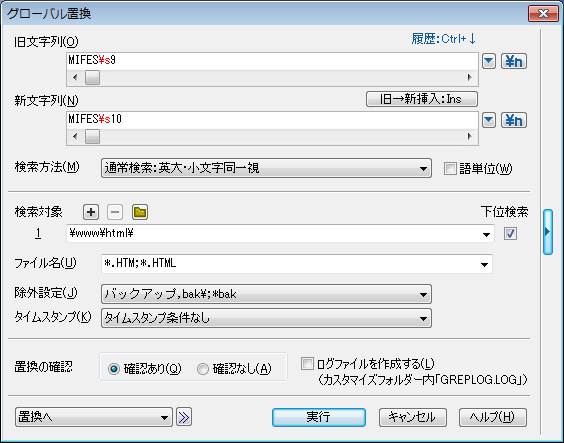 「確認あり」オプションを指定して実行すると、 「置換の確認」画面で置換後の文字列を確認できるので、正規表現で指定した複雑な置換のときにも安心です。
