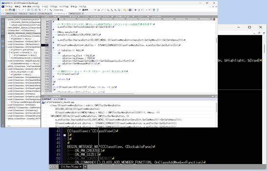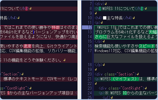 2つのファイルの文字・行の差異部分を明示。見比べながら編集作業。