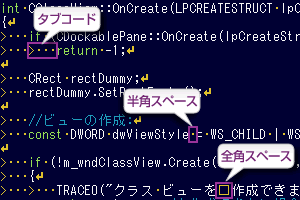対応する括弧や登録済みキーワードの色替え表示の他に、全角スペース、半角スペース、タブコードなどの空白文字をそれぞれ記号で明示できます。
