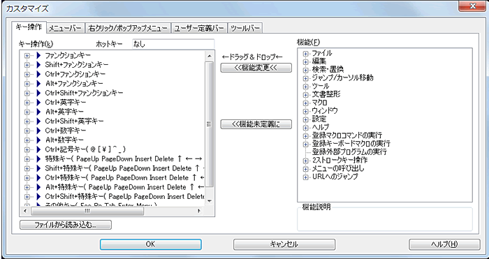 キー操作、メニュー、ツールバー、ユーザー定義バーなどへ、機能を自由に割り当てることが可能です。