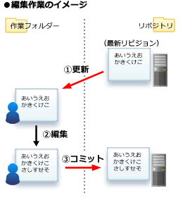 では、具体的にユーザーはどのように日常の編集作業をおこなうのでしょうか。Subversionを例に見てみましょう。