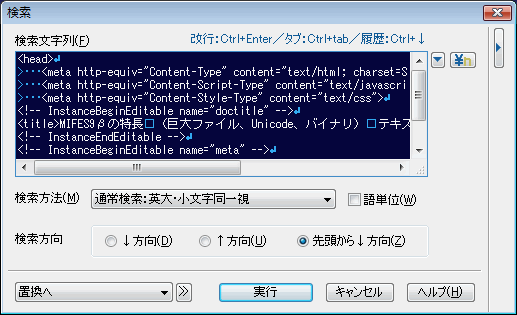 検索・置換文字列欄が複数行表示に対応。改行やタブコードもMIFESの編集画面と同じように表示されます。