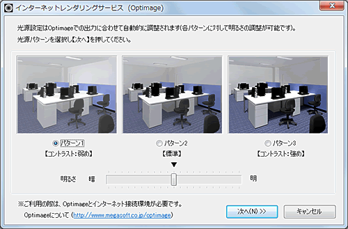 光源設定などの手間もかからず、レンダリング速度(高画質な3Dパースを作成するための計算時間)も高速です。またOptimageの料金は従量制(A4 標準画質1枚のレンダリングで60円)となっているため、実際の使用量に応じた合理的な利用が可能です。