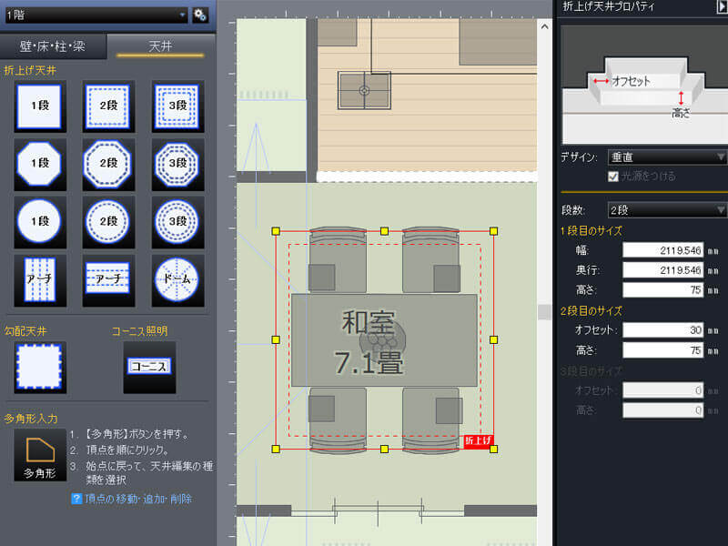床は段差の設定が可能。段差を使った小上がりや掘りごたつなども、簡単に表現できます。