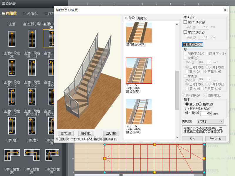 踊り場/回り部分のサイズや位置、段数、踏み面や蹴込みのサイズも自由に設定できます。