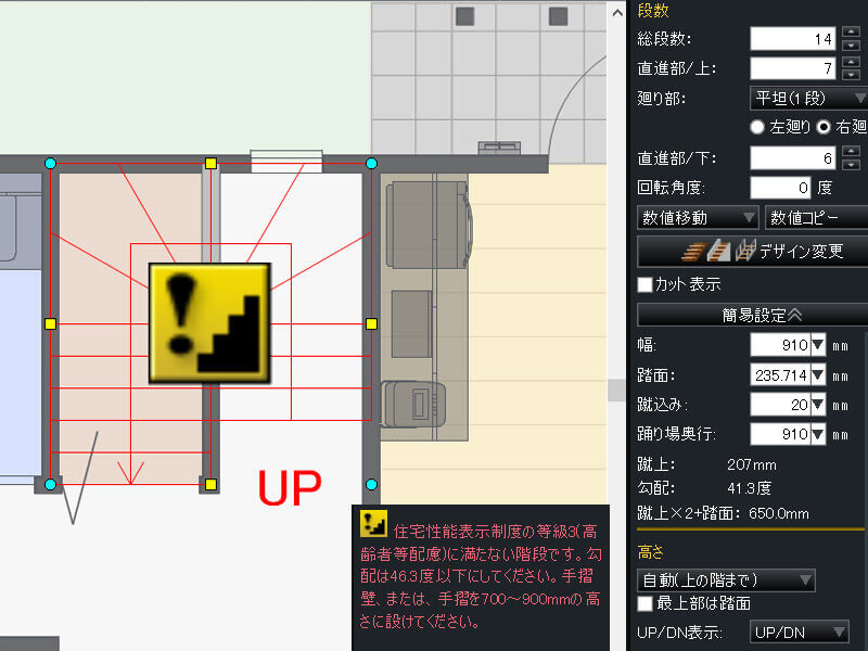 勾配の角度や手摺の設置など、具体的なアドバイスが表示されます。
