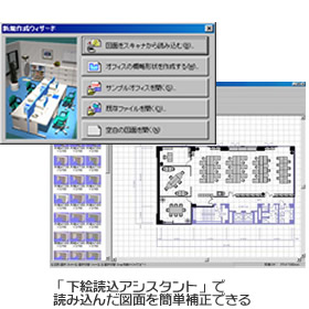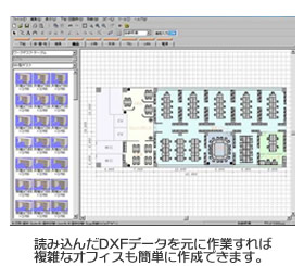 既存の紙図面をスキャナで読み込んだり、CADで作成された2次元DXFデータを取り込むことで、複雑な形状のオフィスも簡単正確に作成でき、作業時間の短縮を実現します。