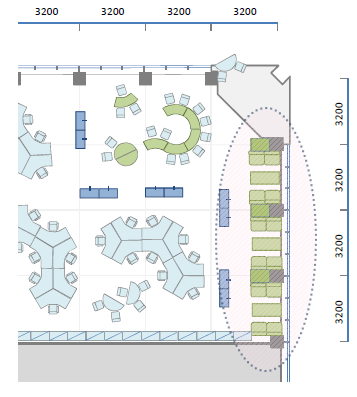高所恐怖症の私にとっては少しきつい話ですが、見晴らしのいい窓辺近くにリフレッシュルームを!という意見はほぼ全員一致のようで、景色の見える西、もしくは南の窓辺のどこかにつくることに。そうそう。忘れてはいけない冷蔵庫や飲料関係の物をしまう「オフィス・キッチン」もリフレッシュスペースの側に必要なため、現在、西の窓辺が有力です。