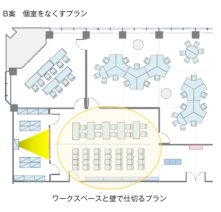 私たちの願い通り、ワークスペースの自由度の高いB、C案。それぞれの違いについてさらに深く話し合いたいと思います。
