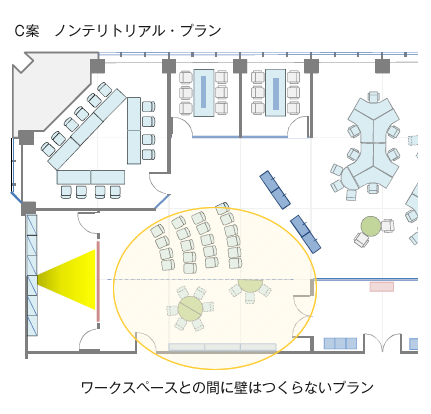 上記の会議がもしC案のようにワークスペースとの仕切りのないオープンスペース、もしくはパーテーションでゆるく仕切られた空間で行われるとどんな問題が発生するのか?