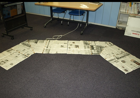 そこで、図面に書かれたサイズと同じものを新聞紙でつくり、実寸で確認することになりました。