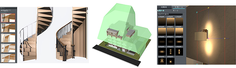 ▲3D編集画面の機能(左から、階段デザイン変更、斜線制限シミュレーション、ライティングの各機能)