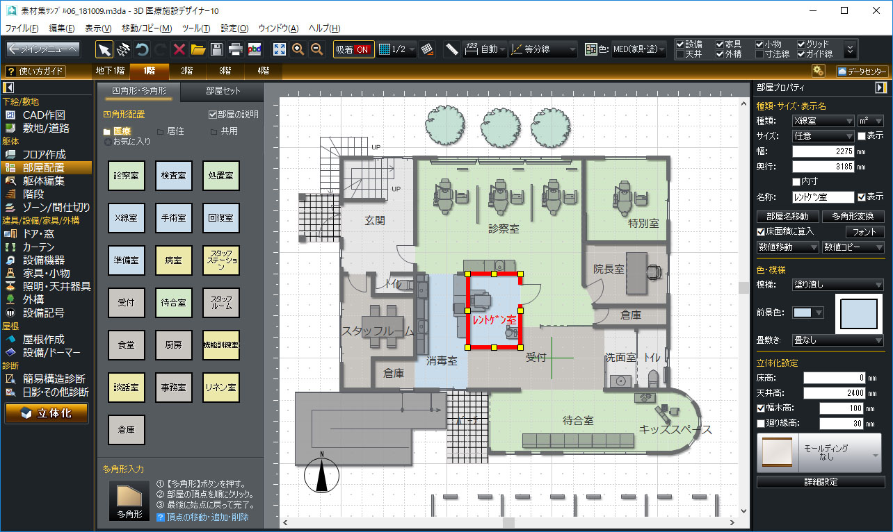 【3D医療施設デザイナー10】は、診察室1部屋から住居兼用のクリニック、総合病院のような複数階の医療施設まで作成できる3DCGソフトです。
