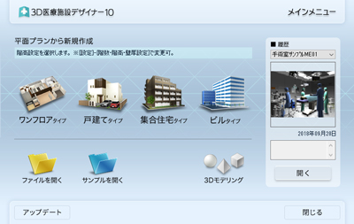 ▲【3D医療施設デザイナー10】起動時に表示されるメインメニュー