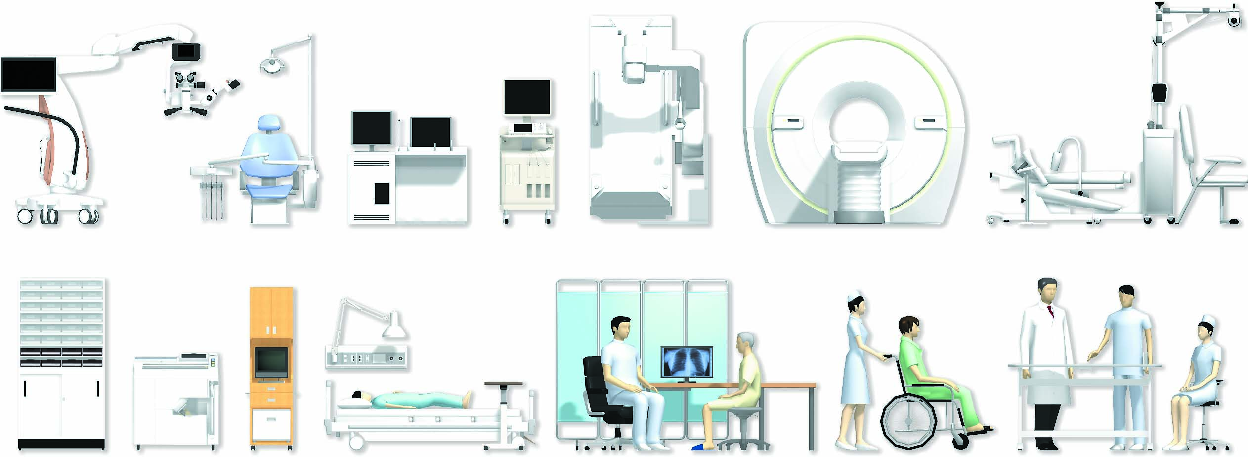 【3D医療施設デザイナー10】は、躯体入力機能と、医療機器・家具・人物など7,000点以上の3D素材を搭載し、マウス操作で医療施設(病院、診療所、介護施設など)のレイアウトとデザインができるパソコン用3DCGソフトです。