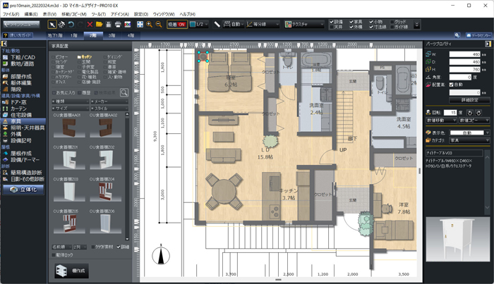 住宅設備や家具素材は、3Dイメージ上でも追加・移動・回転が可能で、壁・床材の変更もマウスドラッグで自在に変更できます。