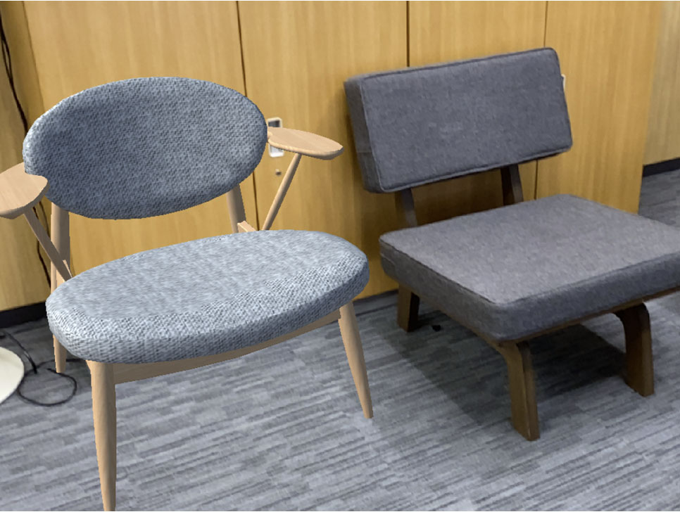 また、製品に収録されている家具や造作した家具(*1)を実空間にARで実寸表示することで、家具のサイズ感や既存の家具との相性チェックにも利用できます。