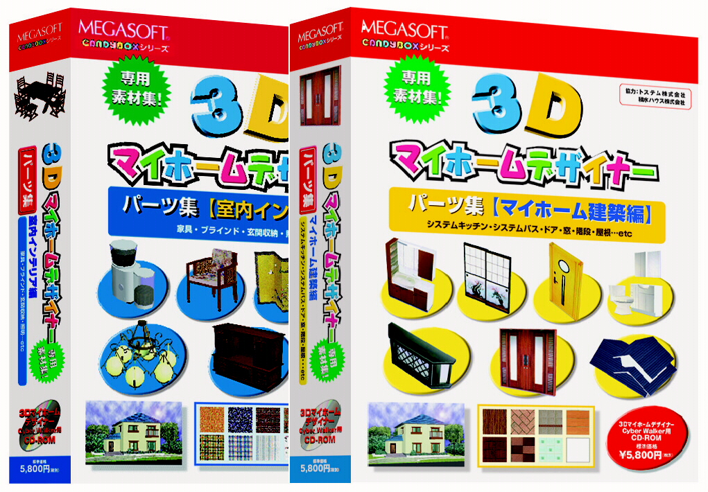 メガソフト株式会社では、来たる5月上旬、 家庭用3Dデザインソフト「3Dマイホームデザイナー」(別売、\9,800)用の パーツ集「マイホーム建築編」、「室内インテリア編」を2点同時発売します。 これは昨年10月の発売以来、本格的3D機能をそなえながらも、誰でも手軽に マイホームデザインが楽しめる家庭用3Dデザインソフトとして好評の「3D マイホームデザイナー」をさらに使いやすくするためのパーツ集で、マイホー ムのイメージづくりに役立つ素材を豊富に収録しています。 収録パーツが一目でわかるカラーのパーツ一覧表が付属し、欲しいパーツを 「3Dマイホームデザイナー」に直接ドラック&ドロップで配置して簡単に使 えます。 また、扉が開く家具など動きのあるマルチメディアパーツや、有名家具メーカ ーの協力により、実在する商品も多数収録した、実用性をかねそなえた優れた パーツ集です。