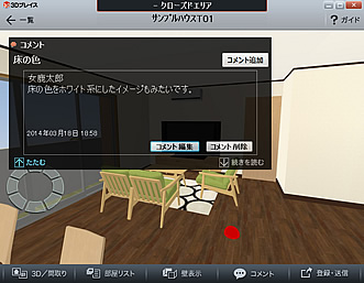 3Dプレイスビューアには、ビルダーと建て主双方がコメントを書き込んでコミュニケーションできるクラウド打合せ機能が搭載されています。今回のWindows版では、使いなれたパソコンのキーボードで要望や質問をスムーズに入力できます。