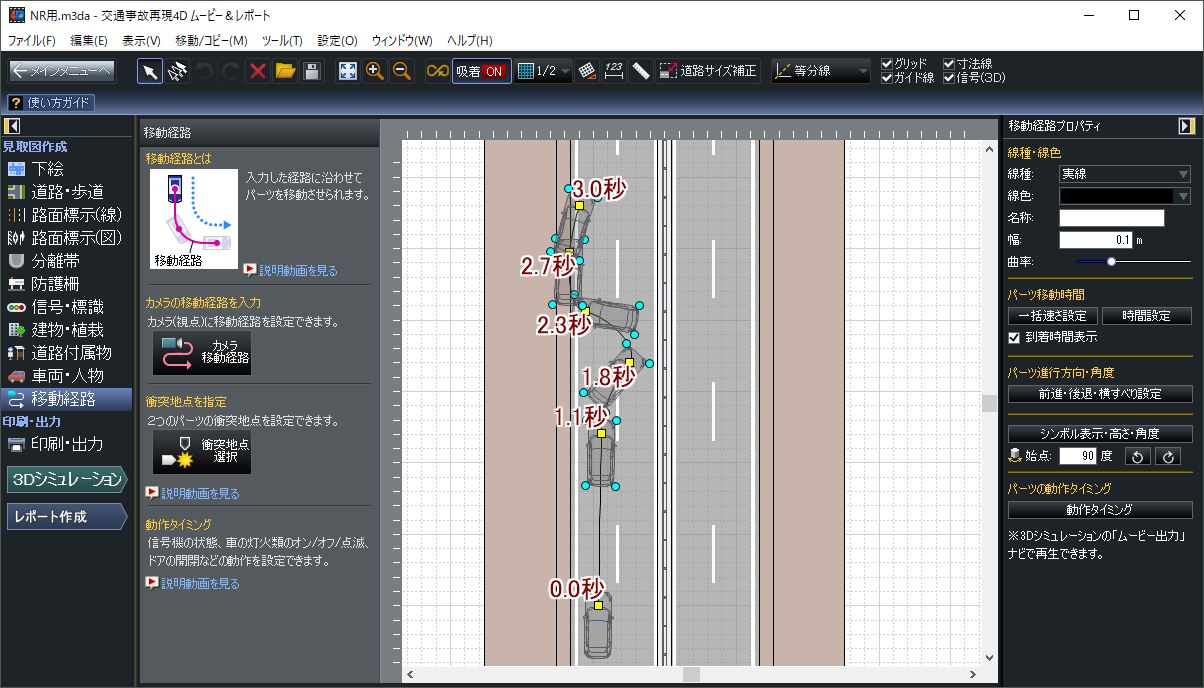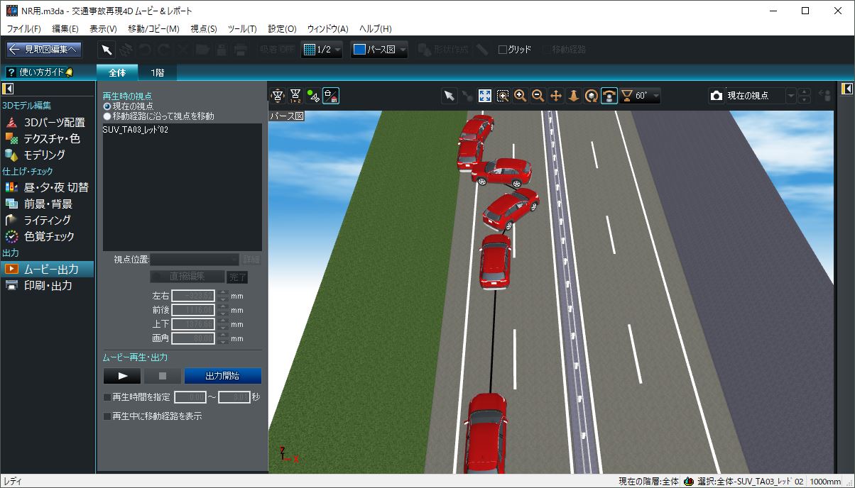 「交通事故再現4D ムービー&レポート」の「4D」は、X-Y-Z値で表現する3DCGに時間軸による動きを追加したことを示唆しています。