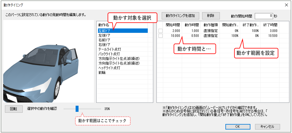 ドアの開閉やライトの点灯など、動作の開始・終了時間、動作させる範囲を設定すると、動画再生時に反映されます。