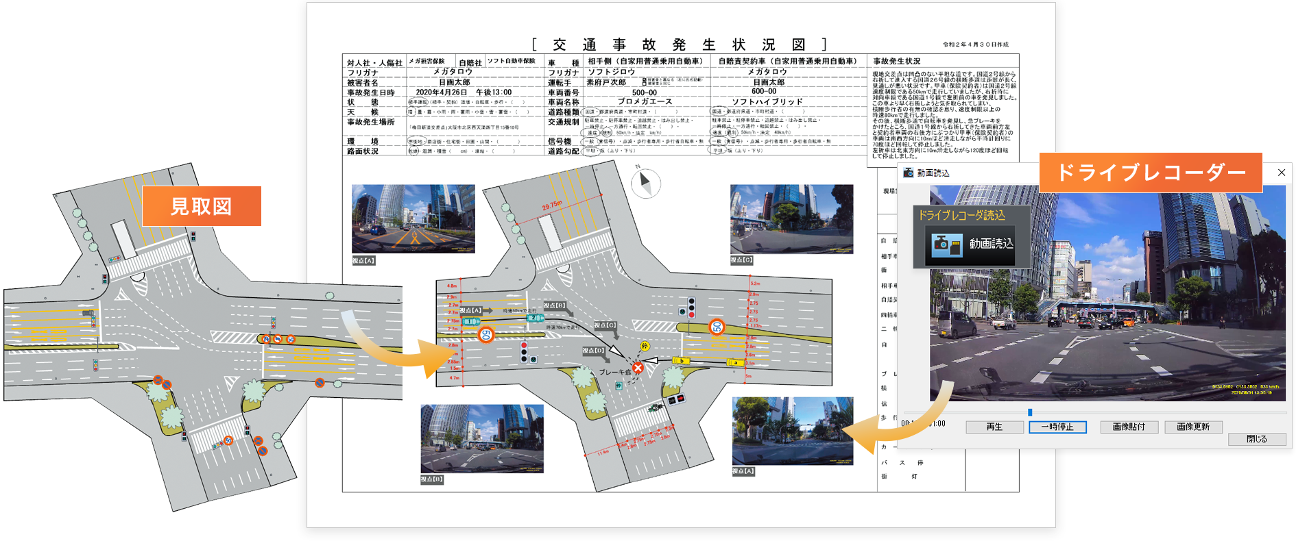 当製品で作成した現場の見取り図やパース、ドライブレコーダーの動画から切り出した画像を配置した交通事故報告書を作成できます。